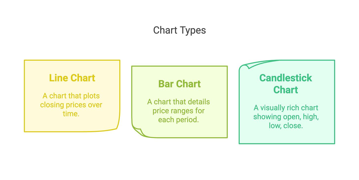 There are several kinds of charts, but let's start with the three most common ones you’ll encounter on the Sahi app or any trading platform: