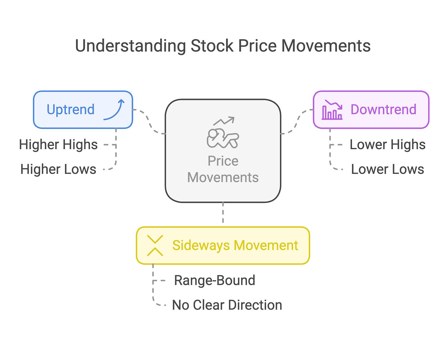 Regardless of chart type, start by looking at the overall direction of the price. Is it going up (uptrend), going down (downtrend), or moving mostly sideways? An uptrend means each successive high price is higher than the previous (and the lows tend to be higher too). A downtrend means each successive low is lower (and highs are lower too). Sideways (or a range-bound market) means the stock is oscillating between around the same high and low without a clear upward or downward path. For example, if HDFC Bank shares move from ₹1,000 to ₹1,100 over a month, that’s an uptrend. If they slide from ₹1,100 to ₹1,000, that’s a downtrend. If they bounce between ₹1,000 and ₹1,050 repeatedly, that’s a sideways range. As a beginner, focus on identifying these broad movements first. You: “Alright, I see the stock was rising steadily last month (uptrend), then it started falling this week (downtrend).” Great! You just read the basic story of the chart.