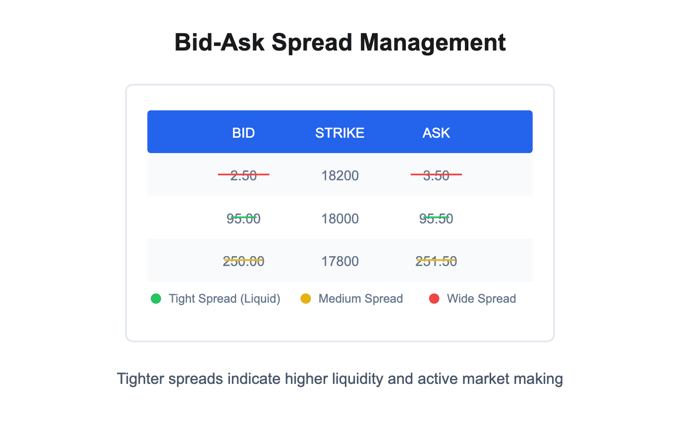 Market makers help keep spreads tight. In a very liquid option (like Nifty weekly ATM), you might see just a 0.05 or 0.1 difference between bid and ask at times. That's because multiple market makers are competing, and plenty of volume keeps things efficient. If no one was making a market, you might find it hard to buy or sell without a big price concession
