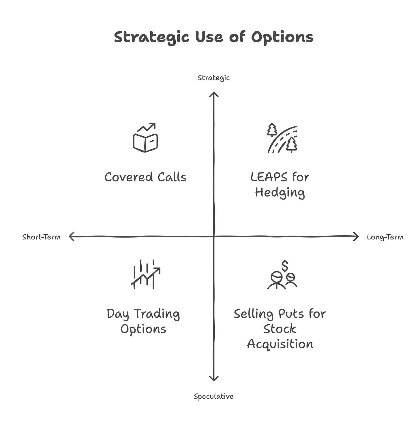 Reality: It’s true that a lot of options activity revolves around short-term moves (weeklies, day trading, etc.). But options can be part of a longer-term investment approach too. For example, an investor might use LEAPS (Long-term options, say 6-12 months out) to bet on a market rise with limited downside, or to hedge a portfolio for a year. Or use a covered call strategy continuously to enhance returns on stocks they hold. Options can generate income (selling premium) or provide insurance. Many long-term investors routinely sell puts to acquire stocks at lower effective prices (if the put is assigned, they buy the stock at strike minus premium; if not, they keep the premium). These are not get-rich-quick but can boost portfolio returns steadily. So, while the adrenaline of short-term trading is there, don't overlook the strategic use of options for long-term goals