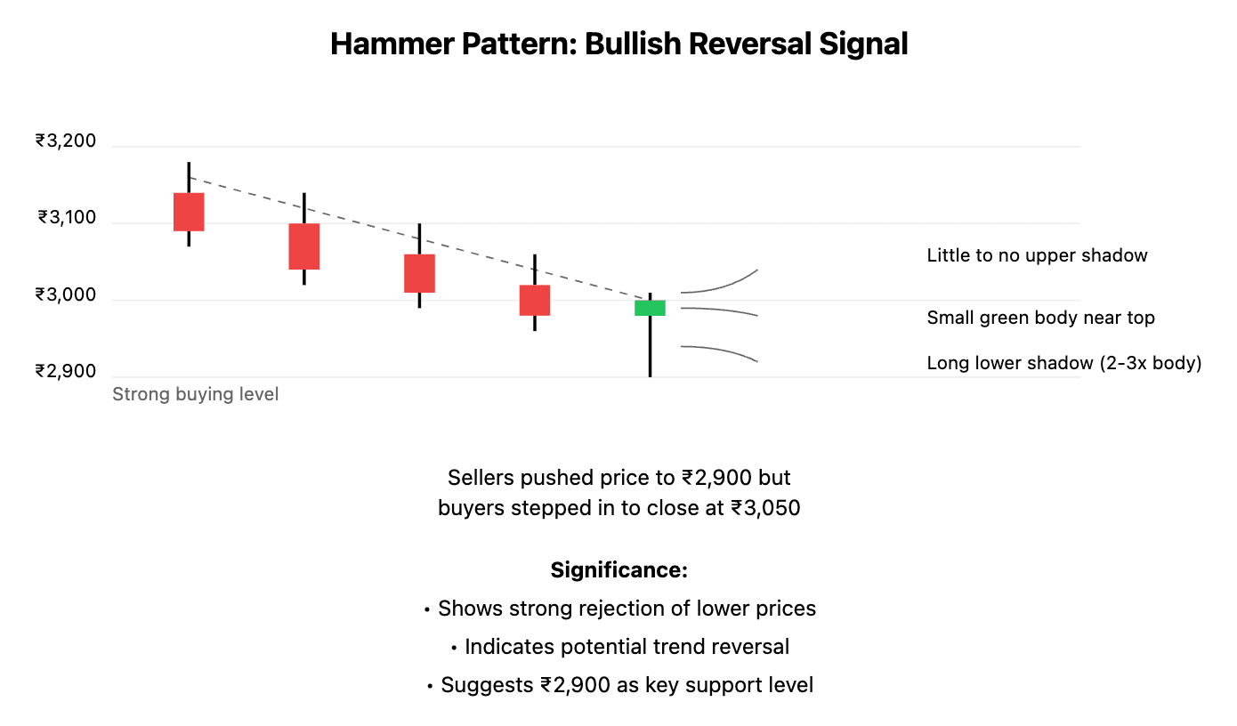 A hammer is a bullish reversal pattern that appears after a downtrend. It has a short body near the top (can be green or red, but green may be slightly more bullish) and a long lower wick (with little or no upper wick). It looks kind of like a hammer with a long handle. This means the stock dropped significantly during the day (long lower wick) but then bounced back and closed near or above its opening price (small body up top) – buyers stepped in strongly. A hammer suggests the downtrend may be ending and an upward reversal could follow. For instance, imagine TCS (Tata Consultancy Services) was falling for a week and reached about ₹3,000. One day it plunges to ₹2,900 (intraday) but then rebounds to close at ₹3,050, forming a hammer candlestick. Traders seeing this might say, “Looks like ₹2,900 is a strong buying level; the stock could be reversing up from here.”