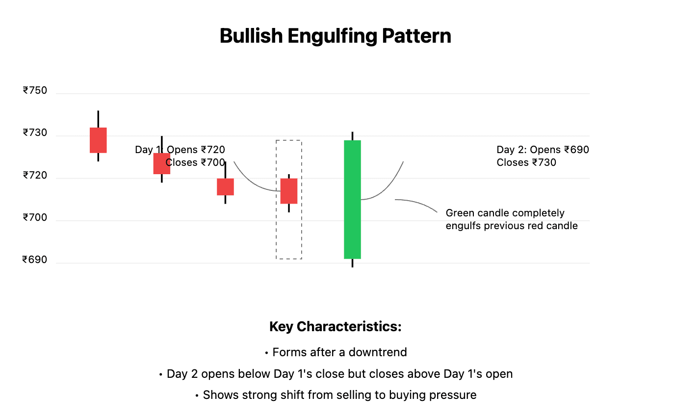 Occurs in a downtrend. Day 1: a small red candle. Day 2: a big green candle that engulfs the previous day's range (its body completely covers the previous day’s body from open to close). This shows a sudden surge of buying strength – buyers not only negated the previous day’s losses but closed much higher. It’s a strong bullish signal that the trend might be turning up. For example, an ICICI Bank stock downtrend might produce a day where it closed at ₹700 (down from an open of ₹720). The next day, it opens around ₹690 but then buyers drive it up to close at ₹730, engulfing the previous day’s range. That’s a bullish engulfing pattern.