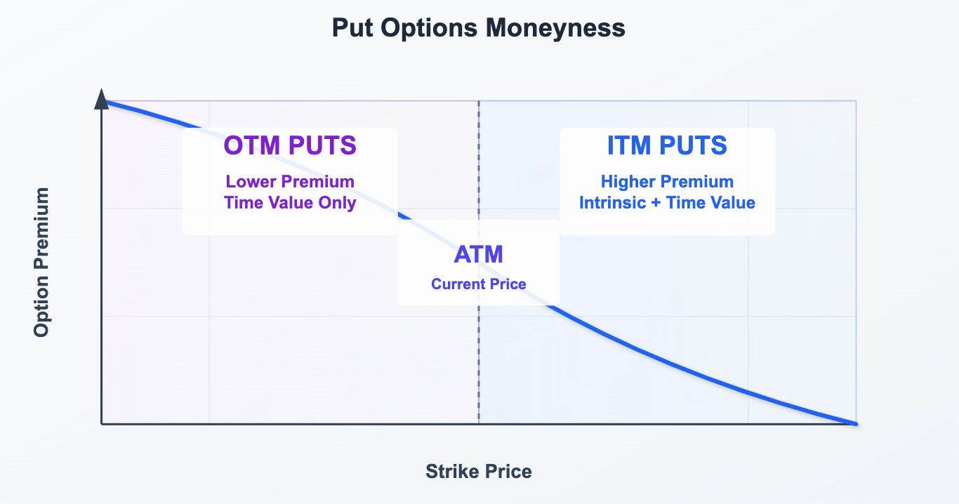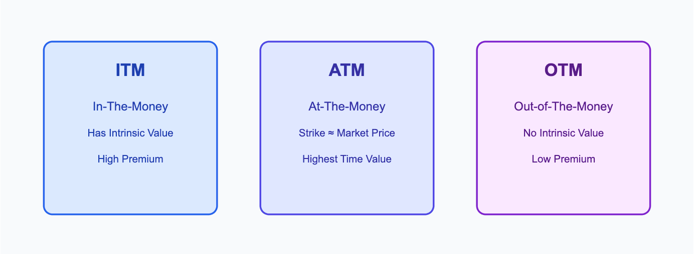 ITM (In-the-Money): The option currently has intrinsic value. For calls, ITM means strike price < current price (you can buy cheaper than market via the option). For puts, ITM means strike price > current price (you can sell higher than market via the option).