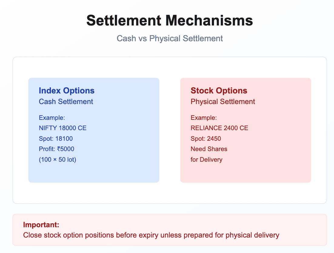 Index Options (Cash Settlement): NIFTY, BANKNIFTY and other index options are cash-settled. This means if your option expires ITM, you get the difference in cash. For example, if you had one Nifty 18,000 Call and Nifty’s closing (settlement) value is 18,100 at expiry, your call is 100 points ITM, so you receive ₹100 * 50 (lot) = ₹5,000 (minus any fees) in profit. If you were short that call, you pay ₹5,000. No actual buying or selling of the index happens (you can’t “buy” the index; it’s just a number).