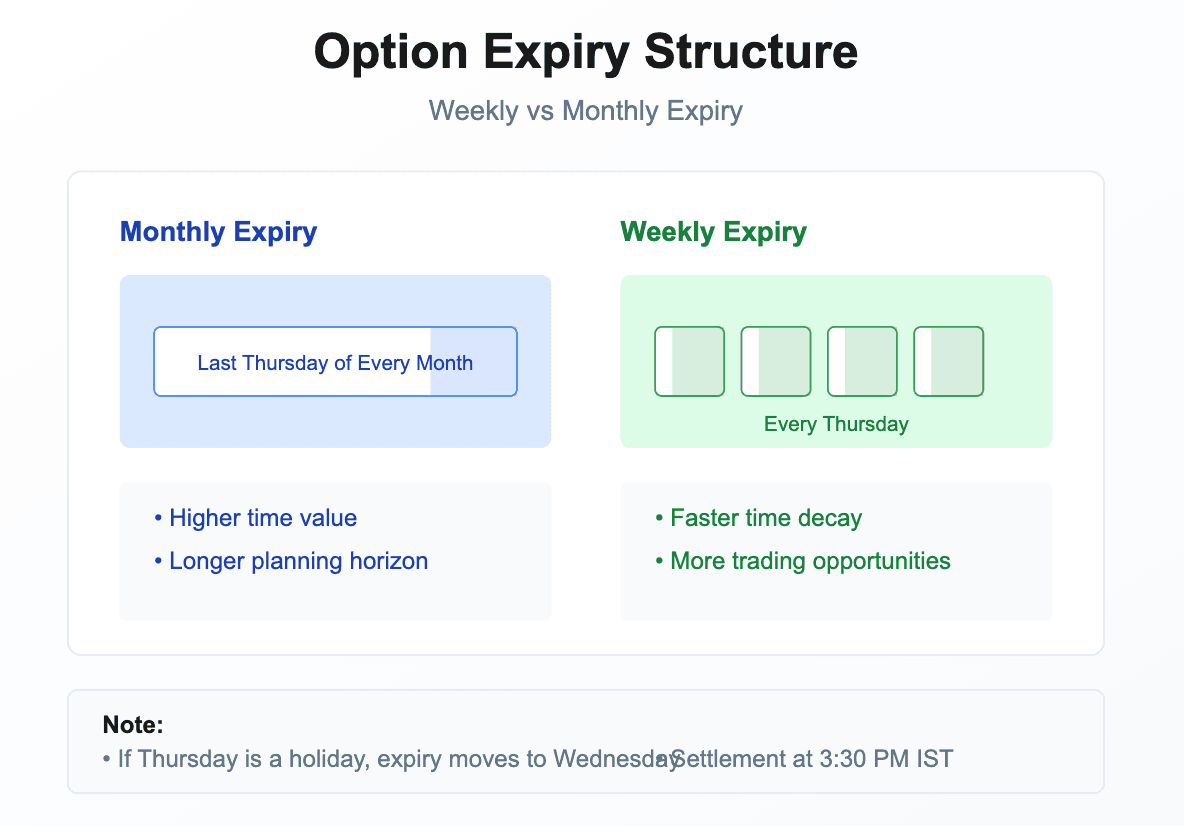 Weekly Expiry: In recent years, weekly index options have gained popularity. NIFTY and BANKNIFTY options have weekly expiries every Thursday (except when Thursday is a holiday, then Wednesday). This means each Thursday, all the options that expire that week cease trading. Weekly options provide more granular opportunities (and risks) for traders and are very popular for short-term strategies. BankNifty, for instance, sees heavy volumes in weekly options.