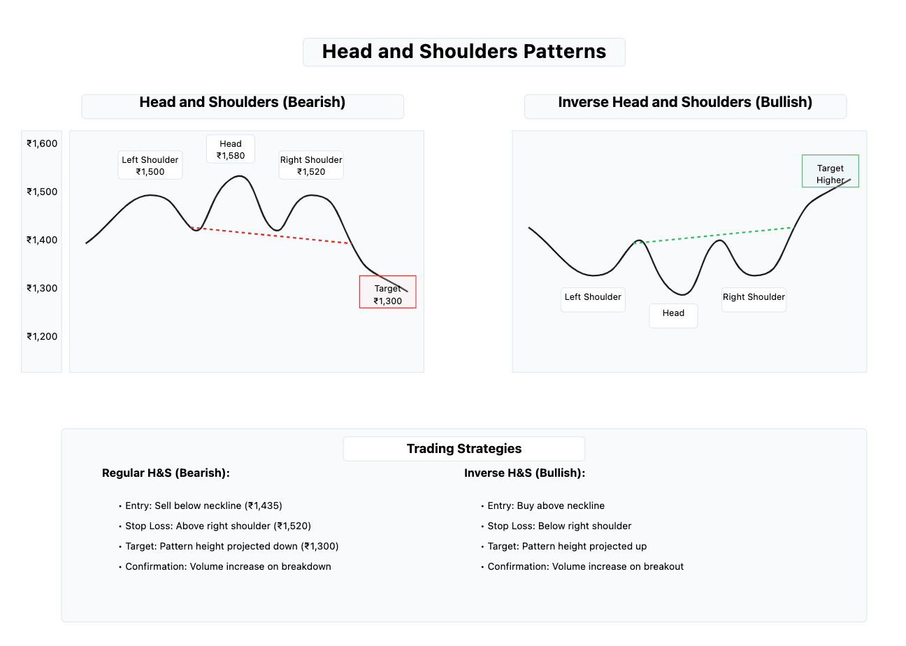 Example: Suppose Infosys stock was in an uptrend and rose to ₹1,500 (left shoulder), dipped to ₹1,420, then surged to ₹1,580 (head) and dipped to ₹1,450, then tried to go up again but only managed ₹1,520 (right shoulder) before falling. The neckline connecting the two dips is around ₹1,435. When Infosys’ price falls below ₹1,435, the H&S is confirmed – many traders would see that as a signal that the prior uptrend has reversed, potentially targeting a further drop (maybe towards ₹1,300 based on pattern height). They might execute a strategy like: sell at ₹1,430, stop-loss at ₹1,520, target around ₹1,300.