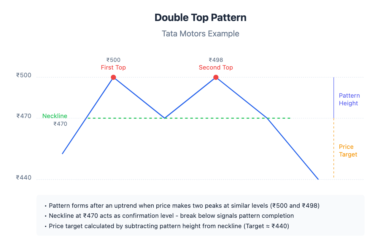 Example: Tata Motors stock rallies to ₹500, drops to ₹470, then rallies again to ₹498 and starts falling. If it drops below ₹470 (the interim low), that completes a double top. Traders seeing this may conclude Tata Motors has formed a medium-term top around ₹500 and could decline further, maybe to ₹440 (approx height of the pattern subtracted).