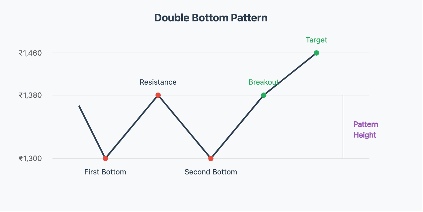 Example: HDFC Bank shares fall to ₹1,300, bounce to ₹1,380, then another wave of selling takes them to ₹1,310 (around the same zone as before) and then they start climbing. When the price later pushes above ₹1,380, the double bottom is confirmed – suggesting support around ₹1,300 is rock solid and the trend might be reversing up. A trader might buy on that break of ₹1,380, expecting a move up perhaps to around ₹1,460 (roughly the height of the W pattern).