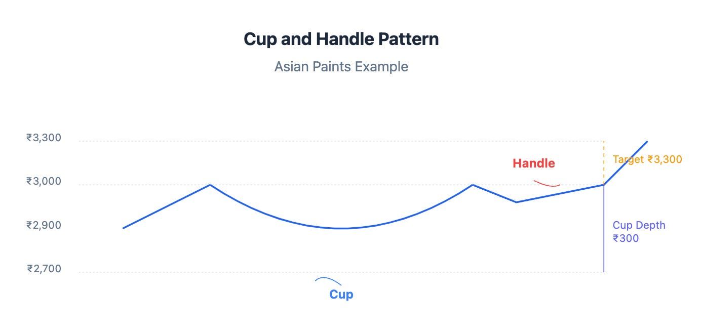 Example: Imagine Asian Paints stock was in an uptrend at ₹3,000, then it slowly pulled back over a month to ₹2,700, and over the next month climbed back to ₹3,000 – that forms a cup. Then for two weeks, it trades sideways/down slightly between ₹3,000 and ₹2,900 – that’s the handle. When Asian Paints’ price then pushes above ₹3,000 with volume, it’s breaking out of the cup and handle. Traders see this as a strong bullish continuation sign and might buy, expecting a significant move up perhaps to ₹3,300 or more (cup depth ₹300 added). A stop might be placed just under the handle’s low (around ₹2,900 in this case) to manage risk in case the pattern fails.