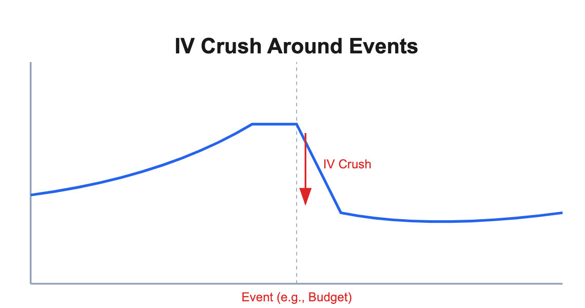 In India, the Union Budget announcement is a major event yearly. Typically, in the days leading up to the Budget, the implied volatility of index options rises, pumping up option premiums. A news article noted: "A common trend observed is that the Implied Volatility (IV) of Options rises in the days leading up to the Budget but subsequently declines sharply during the speech." (Budget day trading strategy: What should Nifty traders do on D-Day? - The Economic Times). Indeed, many traders have seen that right after the Budget speech (once key info is out), option prices drop sharply due to IV crush, even if Nifty doesn’t move much net. If you bought a straddle (both call and put) just before the budget, you needed a huge move to profit, because the post-budget IV crash would deflate the premiums. Sellers of options often benefit in these scenarios by capturing high premium and then IV collapses (as long as the market move isn’t beyond what the premium covered