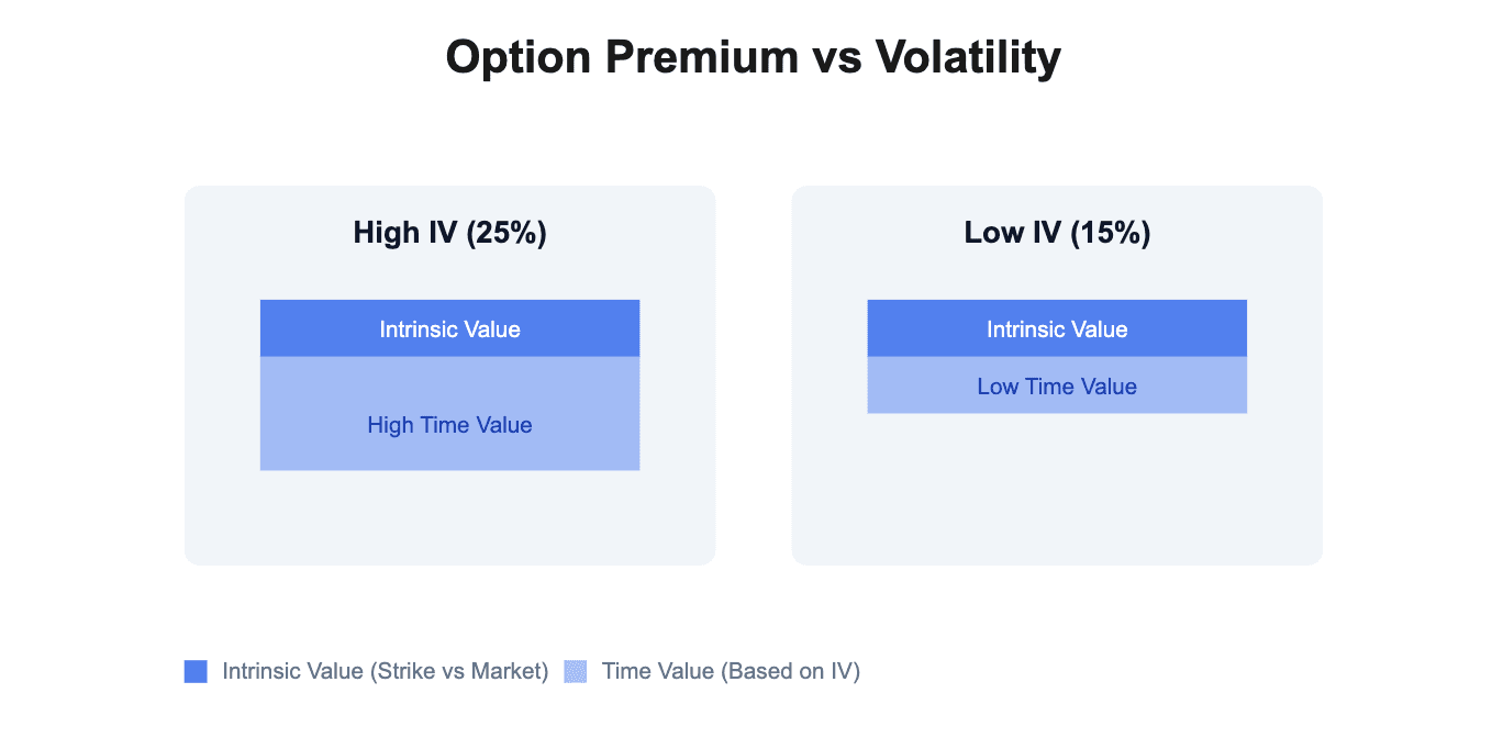 If a stock or index’s volatility is expected to increase (perhaps due to an upcoming event), the implied volatility in options will rise before the event. This causes premiums to go up even if the underlying price hasn’t moved yet.