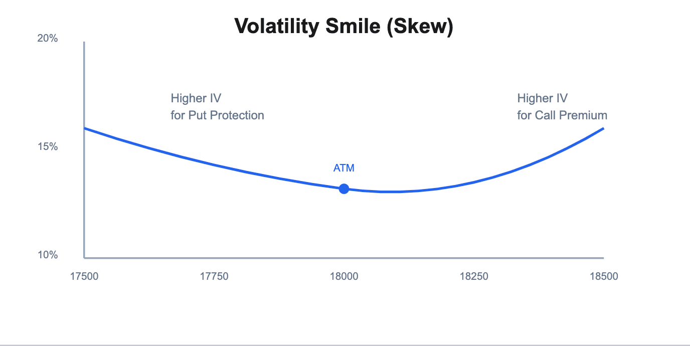 In many markets, not all strikes have the same IV. For index options in particular, often OTM puts have higher IV than OTM calls. This is due to demand for crash protection – investors bid up put prices. The shape of IV across strikes is called the volatility skew or smile. It’s advanced, but just be aware: if you see far OTM puts costing more than equidistant OTM calls, that’s normal in equity indices – the skew.