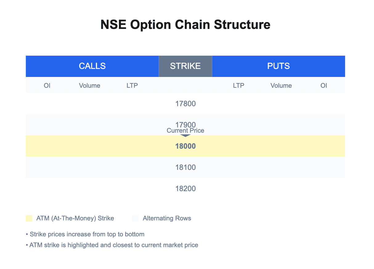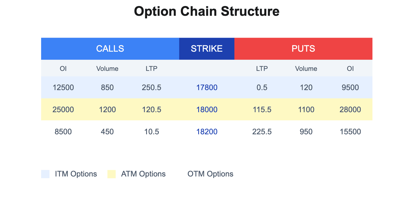 The option chain is your information hub for options on a given underlying. It’s basically a table listing all the available option contracts (calls and puts) for various strikes and expiries, along with their prices, OI, etc. Learning to read the option chain is like learning to read a map of the options market. Let’s walk through an option chain, taking NIFTY as our example, and explain the key columns and how to use them.