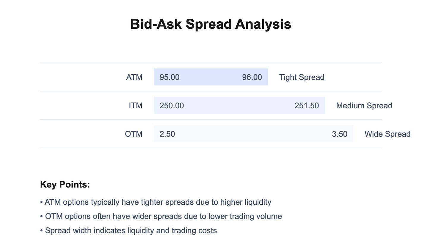 Check Bid-Ask Spreads: Especially if you want to trade a specific strike, look at bid vs ask. For liquid strikes, maybe Nifty ATM call is ₹150 bid – ₹151 ask (tight spread). Far OTM might be ₹2 bid – ₹3.5 ask (wide! If you buy at 3.5, and immediate fair value might be near 2, you’re down significantly on entry). Wide spreads can also indicate risk or low interest. Market makers widen spreads in volatile times, or for far expiries.