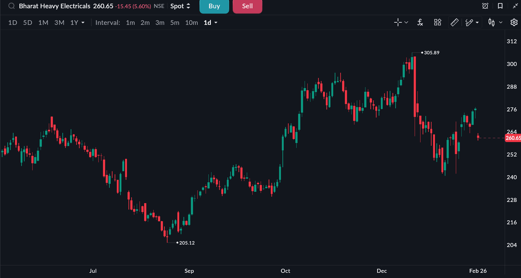 Bharat Heavy Electricals Ltd (BHEL) was trading near ₹260 on February 11, 2026. The stock had earlier touched a 52-week high of ₹305–306. The correction follows multiple developments, including government disinvestment, quarterly performance concerns, and policy discussions.