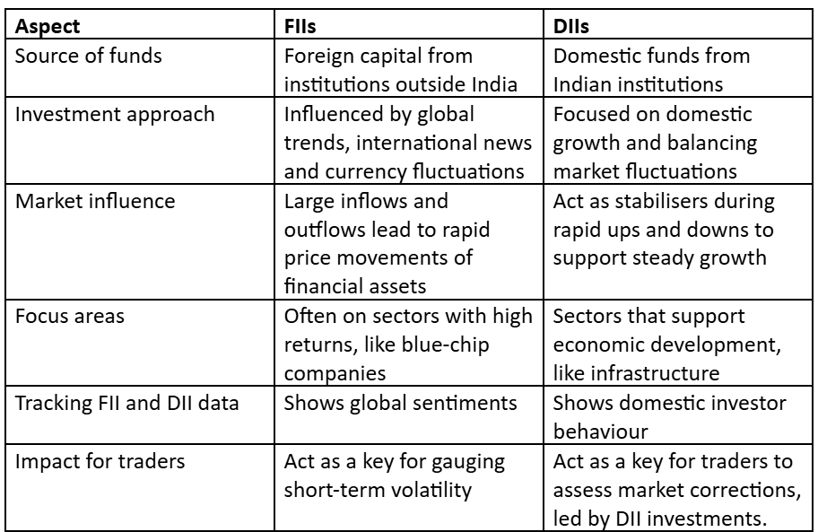 FIIs and DIIs both play important roles in the market, but they operate differently. Here are some major differences: