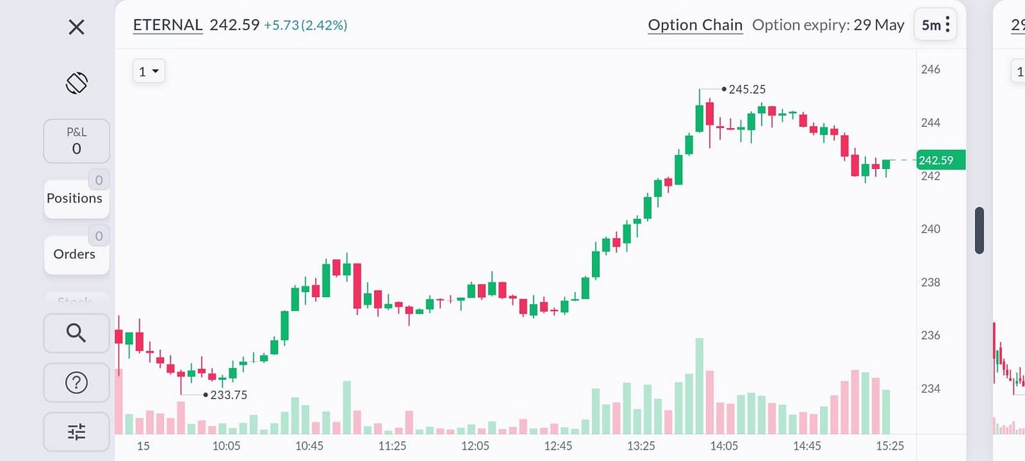 Now available for stock trades and carryforward F&O positions. Execute trades directly from charts in landscape mode for a more immersive experience.