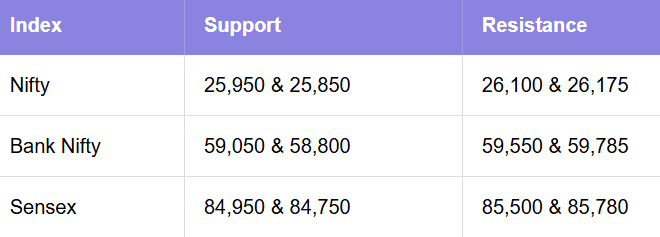 What does this mean? A mildly bearish to range-bound tone. Upside may be capped near 26,100, while dips could attract support around 26,000–25,900 unless put writers start unwinding.
