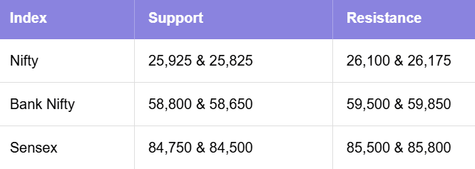 Nifty’s inability to hold the 20-DEMA and the 26,000 zone shows a clear loss of short-term momentum. The index now has immediate support at 25,825, and a break below this could open the doors to a deeper corrective wave. Bank Nifty holds a similar structure, with the critical support zone at 58,650–58,800, while the Sensex faces a key floor near 84,785.