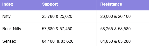 Technically, this looks like a healthy pullback. Nifty has now closed near its 20EMA on the hourly chart, with immediate support seen at 25,620. For Bank Nifty, support lies around 57,500, while the Sensex finds its cushion near 83,620. Holding these levels will be key for bulls.