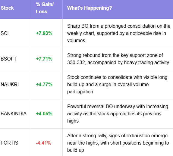 On the flip side, Eternal Ltd. continued to slide, ending as the top Nifty loser with a 2.88% decline. Gold financiers such as Muthoot Finance also came under pressure as gold prices softened over the last 3 days. Interestingly, Textile stocks witnessed brisk buying, on reports of favorable trade negotiations that could lift export prospects.