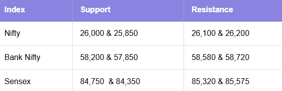 Nifty50 opened on a positive note, moving higher through the session and closing near the day’s high. In the derivatives space, strong put writing at the 26,000PE (67.13L) establishes this level as a firm support zone. On the other hand, notable call writing at the 26,200CE (21.29L) indicates emerging resistance at 26,200.