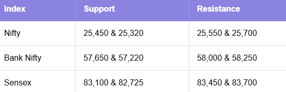 Takeaway: The index appears to be finding its footing near 25,400, with the downside seemingly well-protected. A sustained move above 25,500 could invite further momentum towards 25,575–25,600.