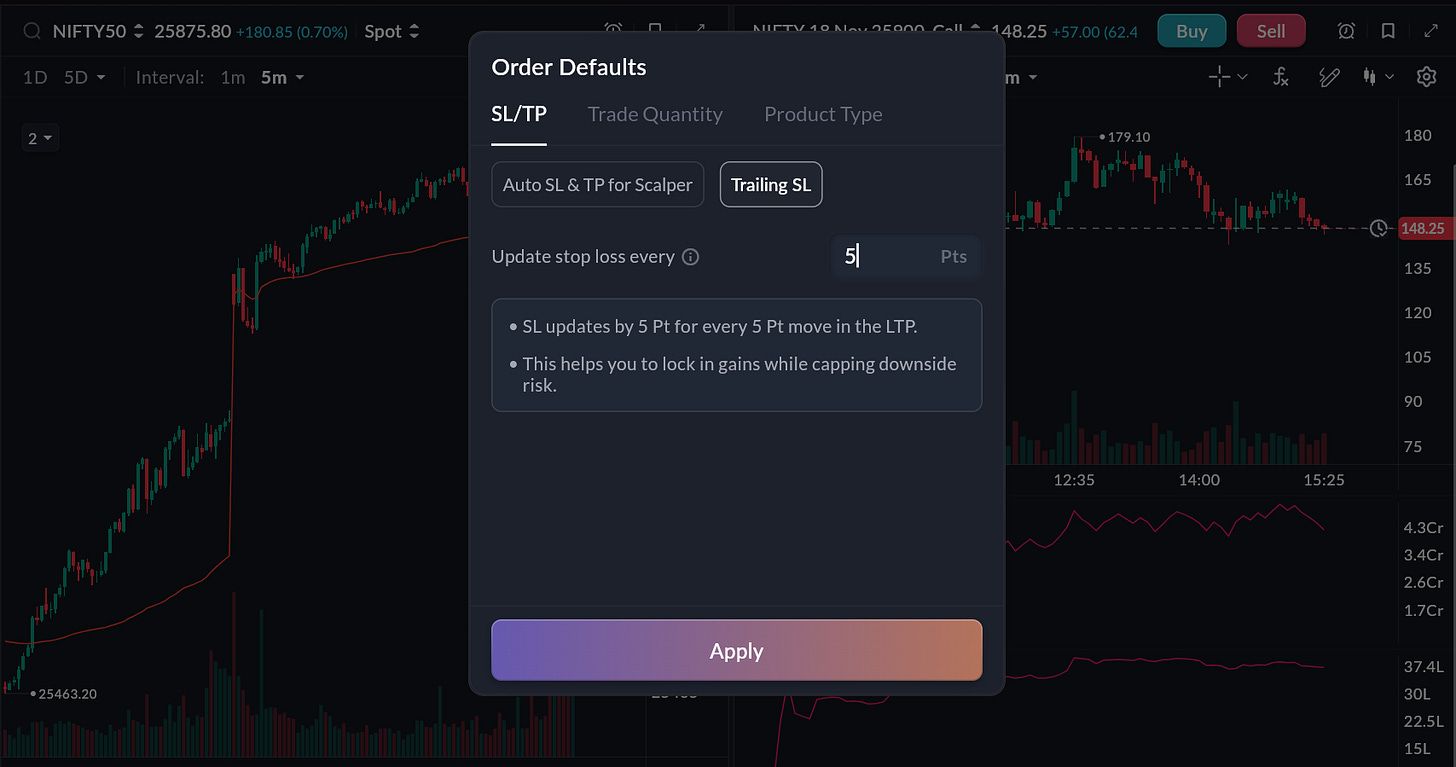 You can set your own trail value , allowing your stop-loss to update exactly how you want it to. If you’re trading volatile options, set a tight trail to protect capital. If you’re holding a trending stock, keep it wider to let profits run.