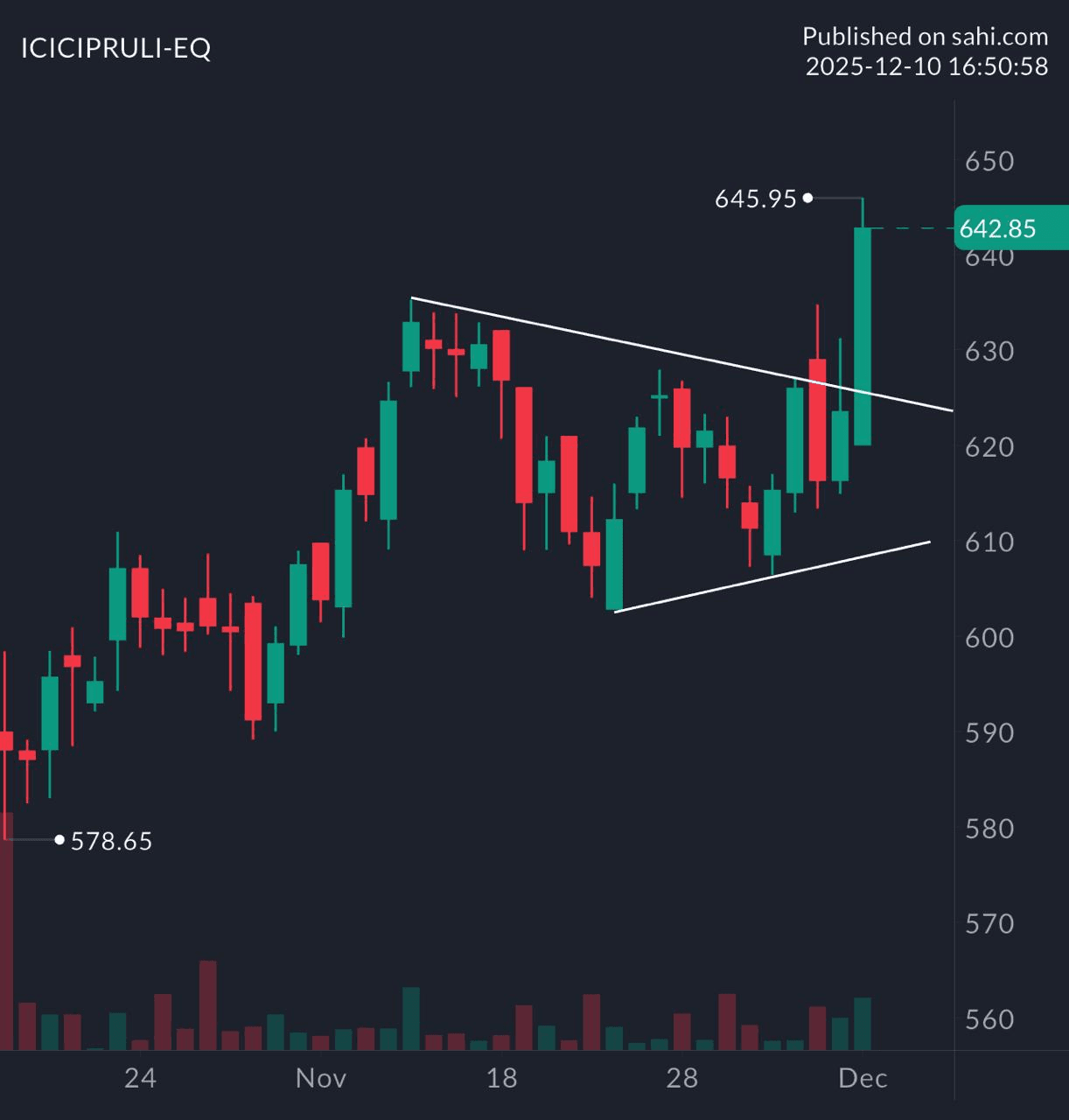 | ICICIPRULI | +3.09% | Contracting pattern breakout supported by strong volume; Golden crossover seen - SMA 50 above SMA 200 |