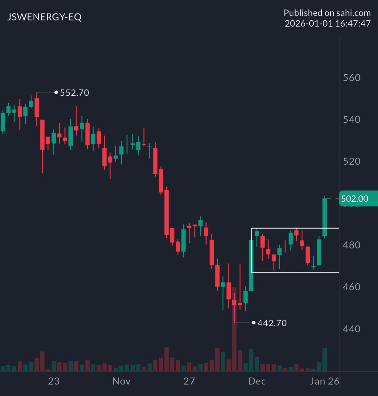| JSWENERGY | +4.05% | Breakout from consolidation, with momentum starting to build |