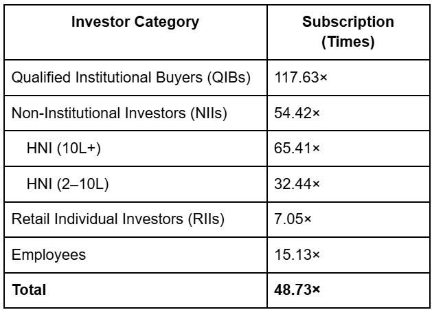 The IPO saw overwhelming institutional participation, led by QIBs subscribing nearly 118 times, followed by strong demand from HNIs and retail investors.