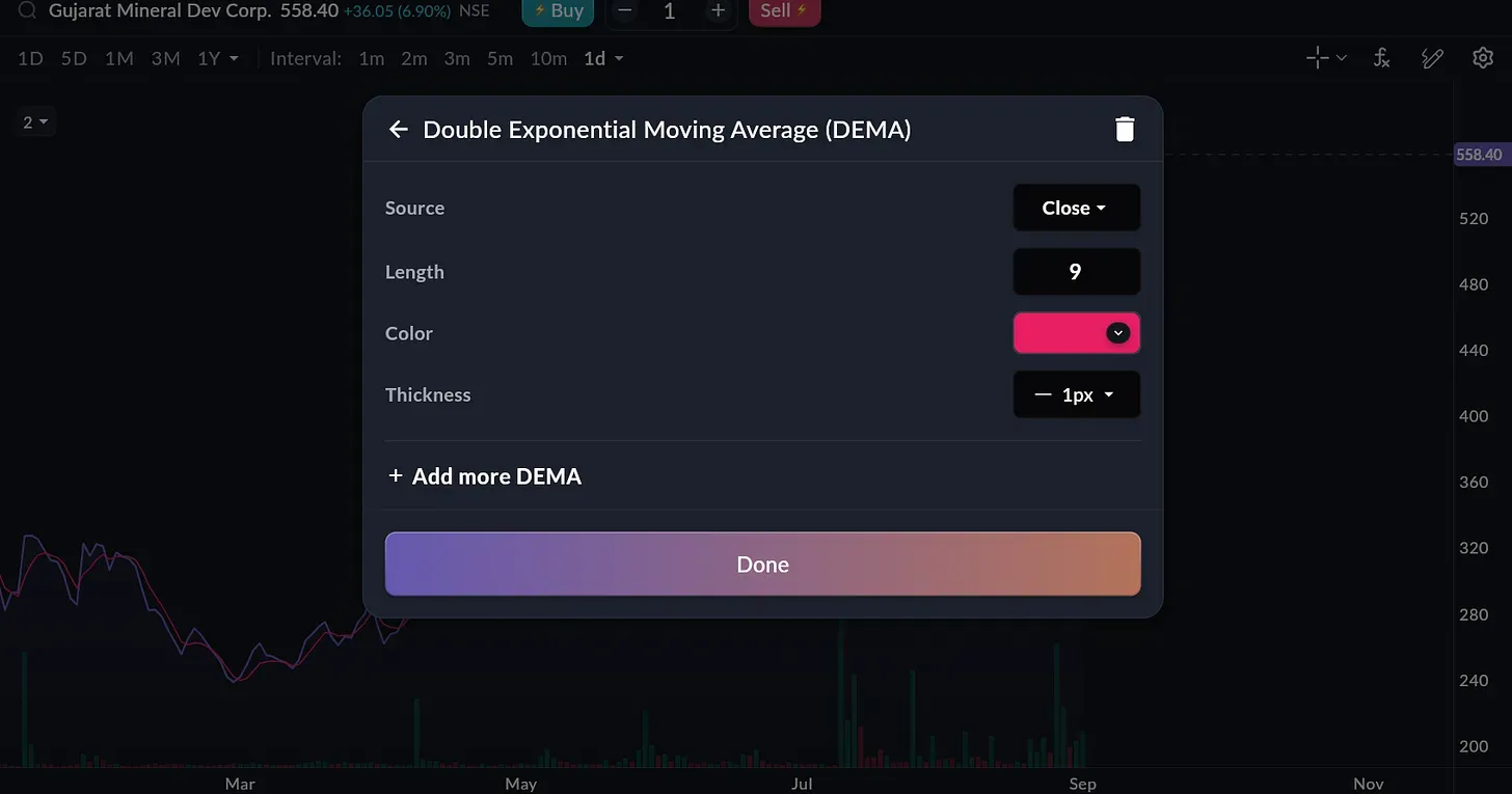 If you overlay a 20-period EMA and a 20-period DEMA on Bank Nifty, you’ll notice that the DEMA responds quicker to sudden rallies or drops, giving you earlier confirmation of reversals.