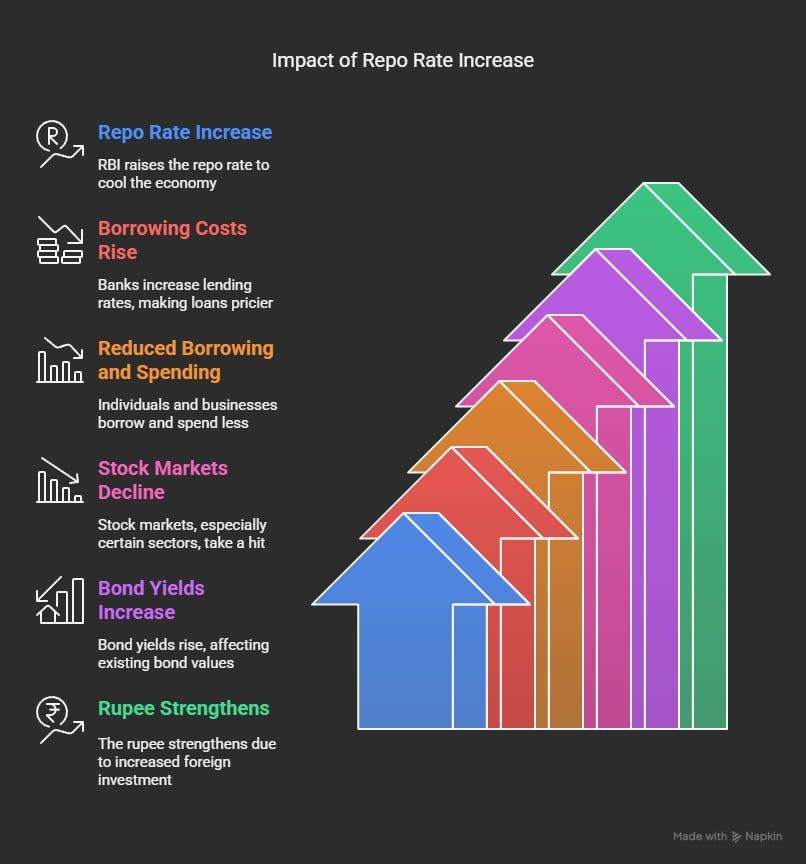 Overall, investors get cautious. A rate hike is like the RBI saying, “Hey, calm down.”