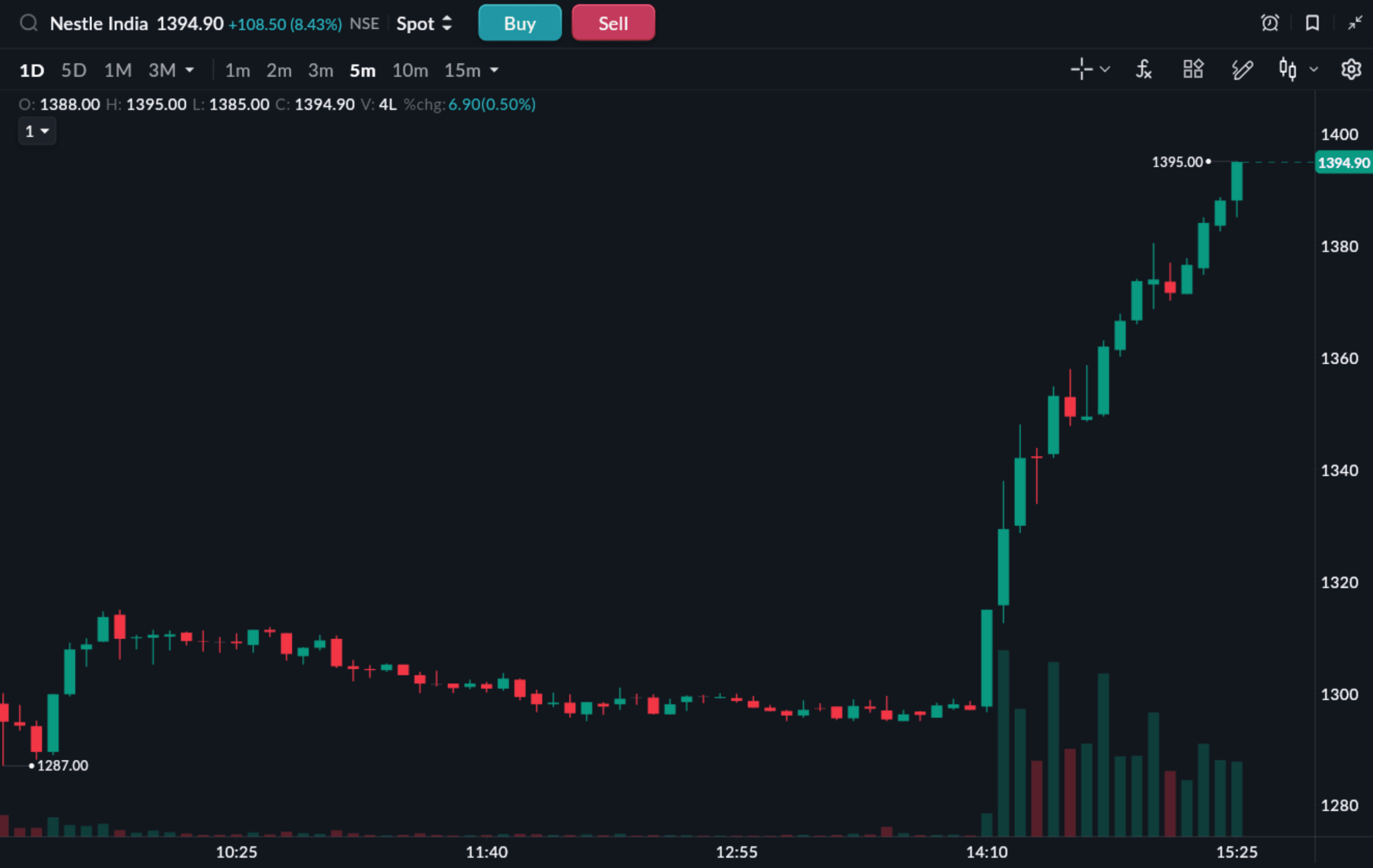 At 3:30 PM on the NSE, Nestlé India shares closed 8.43% higher at ₹1,395 per share, touching their 52-week high during the session.