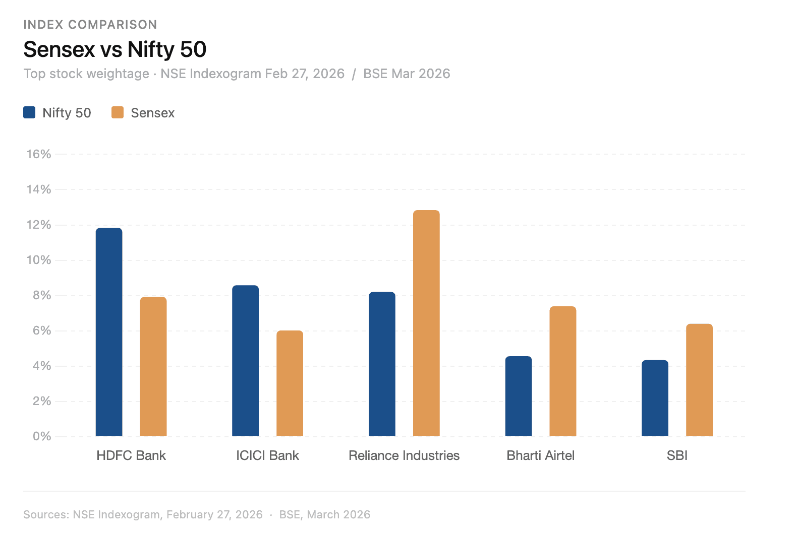 In practice: when HDFC Bank (11.83% of Nifty, 7.92% of Sensex) or Reliance (8.20% of Nifty, 12.84% of Sensex) reports a bad quarter, the index with fewer stocks takes the harder knock. With only 30 names, the Sensex is more sensitive to any single company's move.