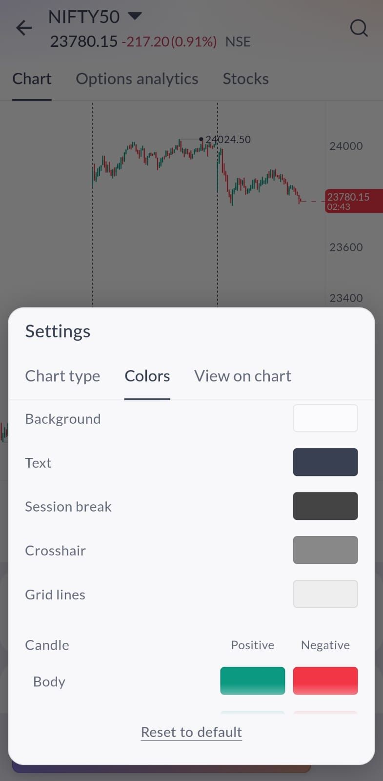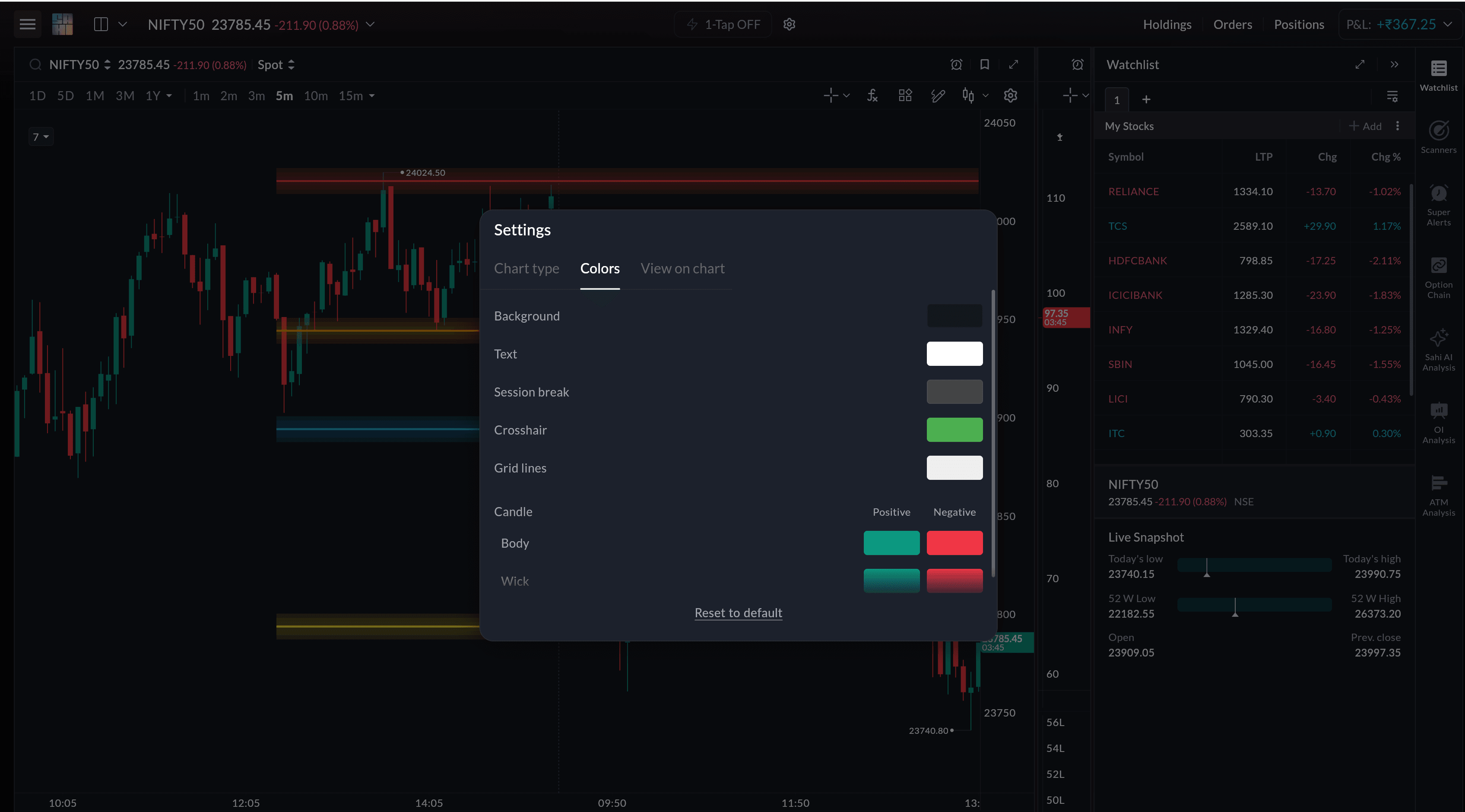 Chart Appearance Customisation on Sahi allows you to personalise how price movement is displayed, helping align the chart with your own visual interpretation of the market.